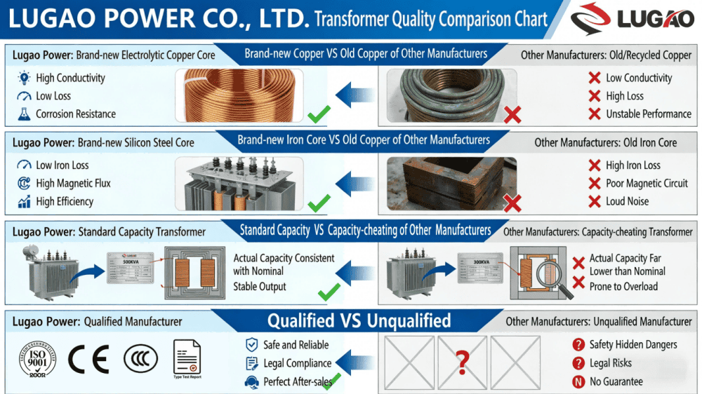 Lugao's driefasige 200KVA 250KVA 400KVA halffabrikaten olie-ondergedompelde distributietransformator maakt gebruik van geavanceerde isolatietechnologie en hoogwaardige siliciumstalen kernen, wat resulteert in verminderde nullastverliezen. Lugao beschikt over een professionele productiefabriek en testfaciliteit, die een strikte kwaliteitscontrole garandeert. Met een ruime voorraad kunnen ze snelle levering bieden en ook OEM-oplossingen aanbieden.
